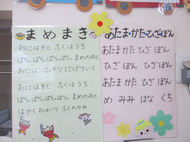 今月は歌詞に飾ってあるオニや壁面の「オニ」を指差して大人気のおうたです!
